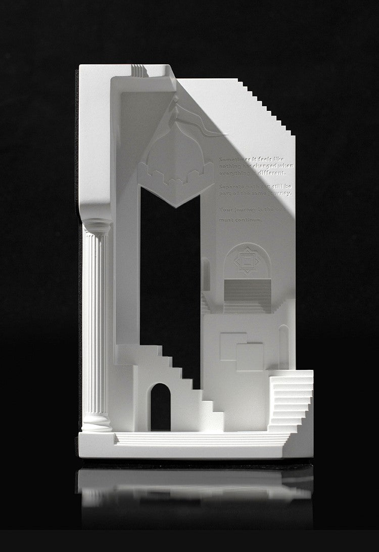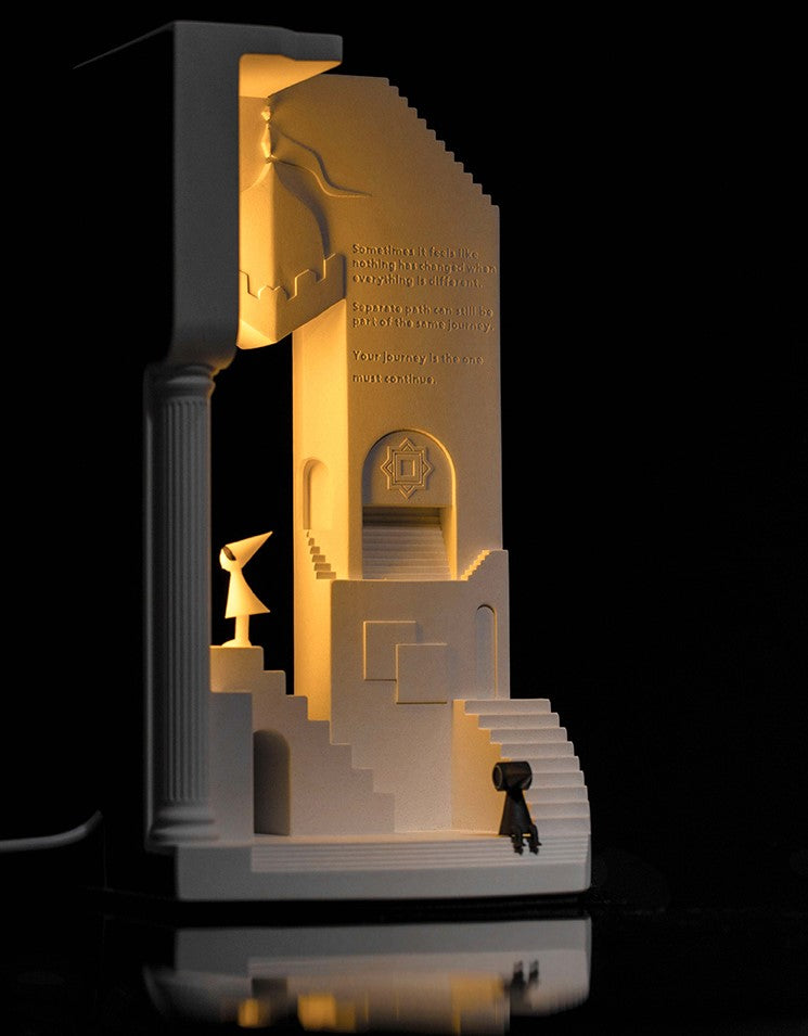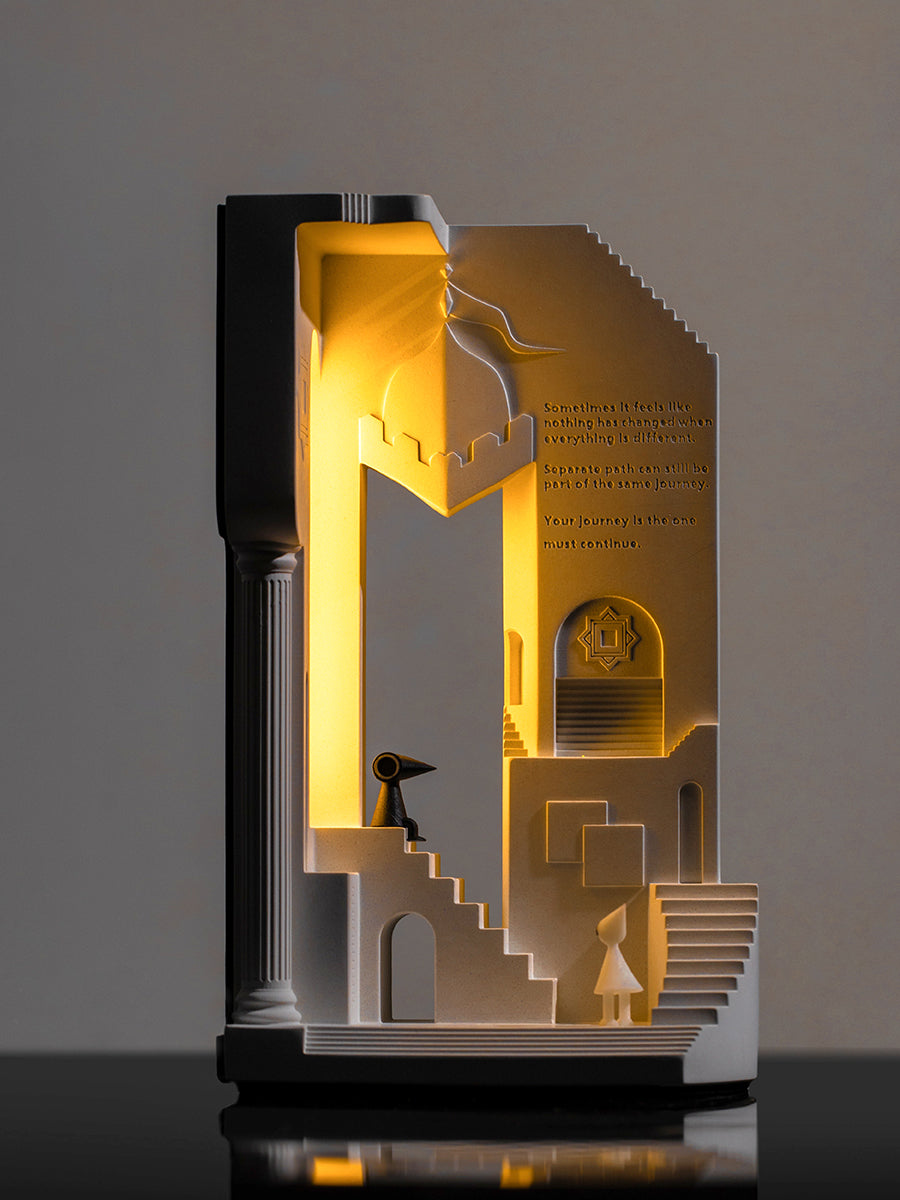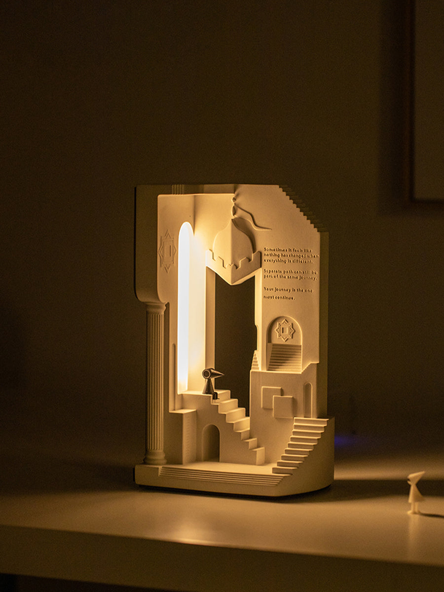 نقدم لكم "الرحلة"، وهي تحفة شعرية في مجموعتنا الرومانسية. يحتضن هذا الديكور الخفيف الساحر جمال رحلة الحياة المتطورة باستمرار، ويضيء مساحتك بوهج دافئ ورقيق. يتميز التصميم الدقيق بنص ملهم محفور على جدار الهندسة المعمارية، نصه: "في بعض الأحيان، يبدو الأمر وكأن شيئًا لم يتغير عندما يكون كل شيء مختلفًا. لا يزال من الممكن أن تكون المسارات المنفصلة جزءًا من نفس الرحلة. رحلتك هي الرحلة التي يجب أن تستمر فيها."